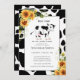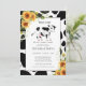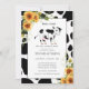 Impressão de Vaca Bebê Convites com um padrão de vaca, uma vaca cortada e girassóis. Gráfico bonito de um bezerro vestindo um girassol no ouvido.