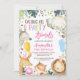 Chamando todos os animais de festa Safari Aniversário Convite Colorido Safari Termo do convite de aniversário com cinco animais da selva e três balões coloridos. Este convite de aniversário para todos os animais da festa também apresenta alguns chapéus de festa cor-de-rosa, verde, estrelas e um padrão de pintura de chita.