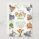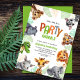 Este convite de aniversário de criança fofo apresenta uma adorável fronteira animal da selva. O texto inteligente diz: Chamando Todos os Animais de Festas. Os animais incluem: leopardo, zebra, rinoceronte, tigre, crocodilo, leão, girafa, elefante e porco selvagem.