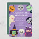 Bonito Spooktacular Costume Kids Convite de aniversário de Halloween Cartão de modelo com fantasia de halloween, com ilustração de crianças em fantasias (morcego, fantasma e vampiro, múmia, monstro). O texto acima diz: "Junte-se a nós se ousar um festival de Dia das Bruxas Spooktacular.