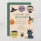 Bonito Spooktacular Costume Kids Convite de aniversário de Halloween Cartão de modelo com fantasia de halloween, com ilustração de crianças em fantasias (morcego, fantasma e vampiro, múmia, monstro). O texto acima diz: "Junte-se a nós se ousar um festival de Dia das Bruxas Spooktacular.