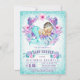 Chamadas de chá de bebê de sereia com adorável sereia bebê enfiada em pérolas em uma bela lavanda roxa e azul lacrimogêneo sob fundo do mar com flores, cavalos marinhos e conchas marinhas. Esses bonitos convites para bebês de sereia são facilmente personalizados para seu evento simplesmente adicionando seus detalhes. Você também pode mudar a cor de fundo nestes convites para chuveiros de bebês de sereia bonito.