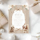 A soft and elegant Christmas invitation featuring a champagne striped background, delicate poinsettia flowers, and cozy holiday details like a teddy bear and Santa in warm neutral tones. Perfect for festive gatherings with a refined, rustic-luxe feel that blends timeless Christmas charm with modern minimalism.