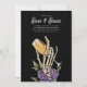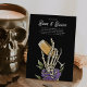 Hospedando um adulto só na cesta de Halloween? Convide amigos com estes convites de chic assustadores com uma mão esquelética levantando um copo de champanhe para um brinde. "Boos e Booze" aparece no topo, junto com os detalhes da festa de Halloween.