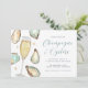 Este convite de festas cônico costeiro apresenta exemplos de ostras de creme suave e aqua aqua watercolor, pérolas e flautas de champanhe, com os detalhes do evento de champanhe e ostras em azul-marinho clássico. Perfeito para as festas de praia, verão, casas náuticas e orelhas de ostras para qualquer ocasião.