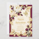 Celebre a sua filha de 15 anos com este clássico e bonito costume feito champanhe branco e rosas burgundy com folhas de ouro e um convite para quinceñera de borboleta ouro. Os requintados florais e botânicos nestam os detalhes da festa com tipografia de ouro num champanhe ou fundo esbranquiçado. Um elegante quadro fino de ouro completa o design junto com a borda de burgundy personalizável. O verso do convite é decorado com um lindo conjunto de folhas de ouro e botânicos no canto superior esquerdo e inferior direito do cartão. No meio, um texto personalizável para uma mensagem sentida, ditado favorito, oração ou vazio se for para um olhar mais simples.