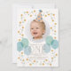 Este convite de 1º aniversário apresenta sua foto com um chapéu de festa rosa e balões azuis e verdes. O verso apresenta um fundo azul claro com padrões aleatórios de triângulos e estrelas. Personalize de acordo com as suas necessidades. Você pode encontrar mais produtos correspondentes na minha loja.