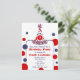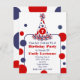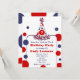 Um convite de aniversário com um esquema patriótico de cor azul e branco. A frente apresenta uma ilustração de uma festa de bolinhas no topo. Personalize o chapéu com o número. Texto rodeado por bolinhas correspondentes. O reverso é bolinhas sólidas.