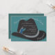 Chapéu Fedora preto com convite de festa de solteiro personalizável com penas. Escolha personalizar e adicione as informações da sua festa nos campos de texto fornecidos. Adicione ou exclua campos de texto conforme necessário. Mantenha ou escolha uma fonte, tamanho e cor diferentes. Use o verso para mais informações, se necessário.