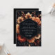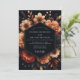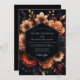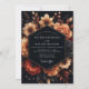 Experience a dramatic and romantic atmosphere with this moody floral design. A stunning arrangement of amber, terracotta, and deep orange blossoms emerges from a dark charcoal background. This rich composition of lush, multi-petaled flowers creates a sophisticated and elegant autumn aesthetic for your special day.