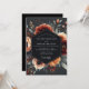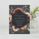 This design features a moody and dramatic floral arrangement. Lush blooms in shades of burnt orange, terracotta, and soft cream pop against a dark charcoal background. Painterly anemones and roses are nestled amongst muted greenery, creating a sophisticated and romantic atmosphere perfect for an autumn affair.