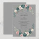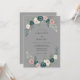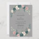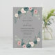 This design features a sophisticated charcoal gray background adorned with lush floral arrangements. Deep teal and blush pink roses create a moody yet romantic aesthetic, accented by soft white blossoms and delicate greenery. Elegant eucalyptus leaves and wispy sprigs add texture to the botanical displays. Ideal for a winter or evening event, the color palette balances dark tones with soft pastel accents.
