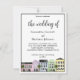 Uma bela ilustração feita à mão da aquarela dos icônicos elementos da linha arco-íris de Charleston no fundo. As matizes do pastel macio das casas históricas se misturam, criando um sentimento sonhador e romântico. Acentos deliciosos como as palmeiras somam ao charme sul. O design de aquarela dá ao convite um toque pessoal, artístico que é simultaneamente eterno e moderno.