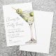 On the right, a watercolor classic martini garnished with green olives brings in that timeless cocktail vibe. The vertical layout keeps everything clean and simple, with the party details arranged in a neat mix of serif and script fonts.