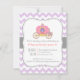 Um encaixe do convite de uma festa de aniversário da princesa com uma imagem de uma carruagem cor-de-rosa da princesa com aparamentos do ouro e as cortinas roxas. Um teste padrão roxo e branco pastel elegante e elegante da viga para o fundo. Este convite do tema da princesa com sua paleta feminino e dos direitos de cor da paleta cor-de-rosa, roxa, branca e cinzenta é ideal para qualquer um que está planeando uma festa de aniversário para suas meninas doces.