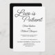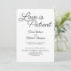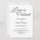 Chic, moderno, elegante, convite de recepção de casamento em preto e branco. Este design apresenta uma tipografia moderna para as palavras "O amor é paciente". Personalize este anúncio de casamento que também serve como convite de recepção com os nomes dos noivos e todos os detalhes da festa sobre a troca de votos e festa de casamento. Este design de layout moderno e elegante é fácil de personalizar.