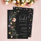 convites de chá de panela na moda com elegantes flores silvestres de cor d'água e seus detalhes em caracteres chicos sobre fundo preto. CORRESPONDENTE a itens na nossa coleção.