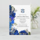 Uma bela ilustração aquosa da mãe das borboletas pérolas voando através de rosas azuis reais e dourado falso e folhagem verde. São ideais para o destino costeiro inspirado na natureza; casamentos, chás de fraldas e aniversários temáticos da ilha tropical e praia. Personalize as modelos para se adequar à sua ocasião.