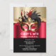 Uma bela máscara falsa de ouro tem vermelhos à volta do topo dos olhos; filigre floral decorativo com penas pretas e suaves, vermelhas e douradas no topo que repousam sobre um cinzeiro falho, ouro cintilante, fundo preto e vermelho. Modelos de texto editáveis em branco são exibidas abaixo do gráfico aquarela para sua redação personalizada. Este design é ideal para uma solteira, chá de panela, aniversário, 16 anos, glama e luxuosa; festa do marco ou quinceanera. Simplesmente personalize os modelos de texto editáveis para se adequar à sua ocasião especial.