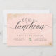 O design perfeito para um almoço de noiva! Este convite apresenta um plano de fundo cor-de-água cor-de-rosa com borrifadas de poeira dourada esmaecida nos cantos. "Luncheon" aparece em uma fonte de na moda, enquanto seus detalhes são mostrados em uma tipografia sans-serif minimalista limpa, com uma delicada folha verde colocada entre eles.
