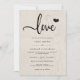 Este convite de casamento da moda diz "amor" na tipografia do estilo da fazenda rustica, com um pequeno coração sobre um fundo de madeira branca O fundo tem um design de listras brancas.