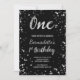 Primeiro aniversario de contadores de prata falsa Um primeiro Convite de aniversário moderno com um convite à folha prateada moderno, original e simples com contadores de ouro rosa e tipografia de pincel escrita à mão sobre um fundo preto totalmente personalizável. . Se precisar de algum texto mudado e personalizado, não hesite em entrar em contato comigo!