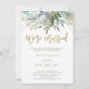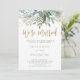 Estes convites elegantes e minimalistas para o brunch pós-casamento apresentam um verde água trendy e folhas botânicas em um fundo branco limpo com uma escrita moderna, falsa e dourada que diz "nós somos casados".