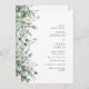 Este convite de casamento para na moda e chic tem lindos verdes sábios e azuis de cor azul-lacrimogênea eucalipto e verde. A parte traseira inclui o mesmo trabalho de arte em um fundo branco.