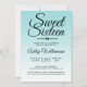 Um design azul de carapaça do mar azul-ombre doce convite de 16 anos. O azul brilhante desaparece sobre um fundo branco. O texto "Doce Dezesseis" a preto é definido na escrita moderna. A limonada cor-de-rosa é usada para este design. Elegante 16.º convite de aniversário para um doce e sexagenário glamouroso, perfeito para ela, a modista que ama padrões modernos, luxo e brilho com um tema de praia de verão. Desenvolvido exclusivamente para você pelo Happy Dolphin Studio.