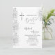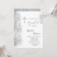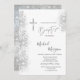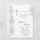 Elegante cruz prateada, e um confete reluzente prateado sobre fundo branco. Convite bonito que pode ser personalizado com seu nome.Selecione o botão "personalizar" para alterar o estilo, a cor e o tamanho da fonte.