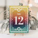 Este belo cartão de número da mesa de casamento inspirado no papel picado apresenta um quadro de ornamentado em branco sobre um fundo de gradiente chic sunset, e tipografia festiva. Esta elegante, porém moderna design é uma opção fabulosa para um casamento latinx, janto de ensaio, festa de noivado ou chá de panela. Consulte coordenando itens na coleção...
