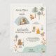 Children's birthday invitation with a camping theme. Features animals like a fox and bear, tent, and campfire. Text reads “Adventure awaits” and gives event details.