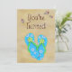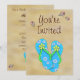 Este convite de aniversário com tema de praia apresenta um par de chinelos de flores azuis, verdes e cor-de-rosa. Eles estão aproveitando uma praia arenosa com alguns conchas espalhadas. Alguns gráficos, por artwork©delightful-doodles.com. ~