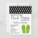 Uma festa na piscina convida a caracterização de uma beira preta com as bolinhas brancas na parte superior com guarnição verde. A ilustração de um par de chinelos verdes endireita no fundo. Personalize o texto preto com detalhes de sua ocasião. O lado oposto é preto com pontos brancos. Etiquetas de harmonização do porte postal e de endereço Look for no Paperie de Jill.