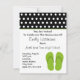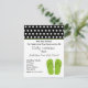 Um convite de festa de aniversário com uma borda preta com bolinhas brancas no topo com um molde verde. Ilustração de um par de chinelos verdes na parte inferior direita. Personalize o texto preto com detalhes da sua ocasião. O lado oposto é preto com pontos brancos. Procure etiquetas de endereço e correio correspondentes na Paperie da Jill.