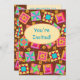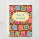 Convide um amante de colcha ou colcha com este convite colorido de colcha totalmente personalizável. Personalize completamente na frente e atrás para adicionar suas próprias palavras, nomes e outras informações. Esta arte original de colcha faz um convite vibrante. A arte quilt baseada na arte original apresenta blocos de manta de retalhos favoritos mais blocos únicos em cores dinâmicas e vibrantes de laranja, amarelo, rosa, turquesa, e verde limão sobre um fundo castanho de chocolate para uma bela paleta colorida. Um oval amarelo ensolarado está na frente do cartão para dizer "Você é Convidado" ou outras palavras da sua escolha. Mostre o seu amor por colchar com estas designs de arte colcha com outros produtos de arte colcha. A arte quilt é uma arte original da designer de tecidos e mantas Phyllis Dobbs e está em uma coleção de tecidos da Quilting Treasures. Esta arte está disponível em outros produtos e em vários planos coloridos. Há mais produtos disponíveis na loja Business da Phyllis com Flair. Corresponder com carimbos coordenadores, envelopes, adesivos e etiquetas de endereço de retorno.