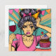 Retro dama com um copo de vinho e cupcake de aniversário chorando no seu aniversário de arte no estilo dos quadrinhos.