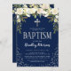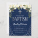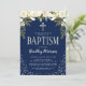 Convites modernos de batismo/batismo com um fundo azul marinho que pode ser mudado para qualquer cor, elegante brilho prateado espalhado, uma cruz religiosa, um display floral e um modelo de texto que é fácil de personalizar.