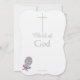 Chamadas Elegantes para Filha de Natal com simples cruz prateada pintada à mão com sotaques dourados na frente e atrás da carta. Fresco e com aspecto estaladiço. Christening e Child's Name estão escritos em bonito roteiro rosa. Personalize com o Primeiro ou Primeiro Nome e Meio do Seu Bebê, Data de Natal e detalhes. O fundo tem fundo branco com a frase Criança de Deus em texto prateado. Imagem de chocalho prateado com estrela rosa e Love escrito em texto branco. Arte original e Design © TamiraZDesign.