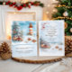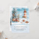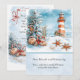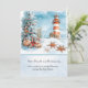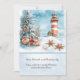 This Christmas card illustration features a charming coastal winter scene where holiday cheer meets the seaside. A snow-dusted evergreen tree decorated with candy canes, ornaments, and starfish stands beside weathered beach fencing, its branches heavy with festive details. In the distance, a red-and-white striped lighthouse glows warmly against a soft blue sky as gentle snow falls over rolling ocean waves. Seashells and starfish rest in the snow along the shore, adding a whimsical nautical touch that blends Christmas magic with a peaceful seaside setting. Personalize with your own information.