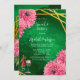 Uma ilustração delicada de aquarela, com uma estrutura geométrica dourada contra um fundo verde esmeralda. O quadro é adornado com crisântemos rosa-quente vibrantes colocados ao longo das bordas externas. Todo o design tem textura aquosa macia, misturando elegância com um toque floral natural.