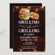 Convites de festas de CHURRASCO de Aposentadoria Casual para grelhar e refrigerar. É fácil personalizar. Todo o texto é ajustável e fácil de mudar para as necessidades do seu próprio partido. Elementos de fundo rusticados das luzes de string. Diversão Chalkboard espirra e floresce. Hambúrguer de aquarela e gráficos de hotdog. Convites para ele. design de bar ou CHURRASCO de quintal. Em qualquer idade, apenas mude o texto.