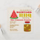 Um convite para CHURRASCOS de quintal com ilustração de uma fatia de melancia no topo esquerdo e um dispensador cheio de chá doce e cunhas de limão no fundo direito. Personalize o texto vermelho, verde e preto com detalhes da sua ocasião.