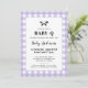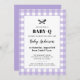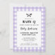 Celebre a mamãe e o bebê a estarem com este convite de festas de churrasco de quintal bebê-q que apresenta uma alegre tomada do padrão clássico de pano de piquenique de xadrez gingham em púrpura e branco pastel mais o detalhe charmoso das ferramentas de grelhar com um coração. Personalize o texto para se adequar aos detalhes do seu partido com caixas de texto flexíveis ou mude ainda mais sobre o design, como as cores e as fontes.