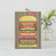 Hamburger empilhado original com cebolas, salmoura, alface, cachorro quente, queijo, mostarda, ketchup, em um fundo rústico do woodgrain. Um teste padrão vermelho do piquenique do guingão é na parte de trás do convite. Seu convidado amará este convite original da festa de noivado. Personalize com seu próprio texto. Verifique por favor minha loja para ver se há mais como esta. Ilustração original pelo pj_design. Envie-me por correio electrónico se você precisa a ajuda. Você pode fazer a isto um cartão maior personalizando o e clicando nas opções de papel.