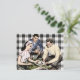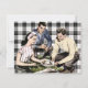 Convites que incluem uma ilustração da década de 1940 de pessoas que gozam de um churrasco ao ar livre. O fundo é uma xadrez preta e branca. Personalize-os com o seu próprio texto. Legal!