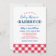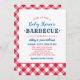 Convite moderno à chá de fraldas para um evento casual de CHURRASCO de quintal em cores vermelho, branco, azul e marinho patrióticas, com uma borda padrão de xadrez de mesa de gingham. Cores neutras de gênero funcionam para um menino ou menina.