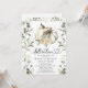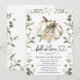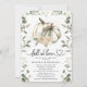 Um convite de chá de casal de outono elegante perfeito para celebrações outonais. Com um fundo branco chic, uma abóbora branca aquarela com brilho de ouro falso, flores brancas, eucalipto e outras verduras botânicas. A frase doce e romântica 'Chuva de Amor' em caligrafia e um modelo de chá de casal que é fácil de personalizar.