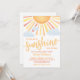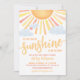 Celebre a chegada iminente com este convite de chá de bebê ensolarado, brilhante e alegre. No topo, um grande sol com raios vibrantes em tons clássicos de amarelo, laranja e vermelho brilha, cercado por algumas nuvens suaves de azul claro para um toque doce e divertido. A frase "Um pequeno raio de sol está a caminho!" é exibida em uma mistura divertida de fontes modernas e tipografia em negrito, colorida para combinar com os raios quentes do sol.