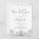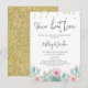 Convite de chuva de amor casal com caligrafia moderna, apresentando um arranjo de cacto florido rosa, algumas bolinhas douradas e verso com glitter dourado.